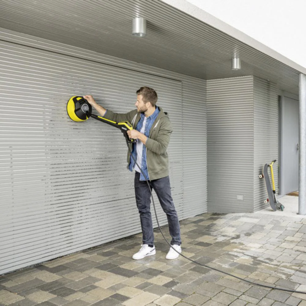 The twin-jet rotating arm of the T 5 T-Racer surface cleaner is capable of removing dirt over large areas - for fast and efficient cleaning of large outside areas. Ultra practical: The surface cleaner can be adjusted so that the nozzle is positioned an ideal distance from the surface, depending on the surface being cleaned. This means that hard surfaces, such as stone and concrete, can be cleaned just as effectively as more delicate surfaces, such as wood. The T 5 T-Racer cleans in around half the time needed for a spray lance. What's more, the hood reliably protects you and your surroundings from spray water, and the 'hovercraft effect' makes manoeuvering simpler than ever. Even vertical surfaces, such as garage doors, can be cleaned efficiently thanks to the ergonomic handle. Suitable for pressure washer ranges K 2 - K 7.